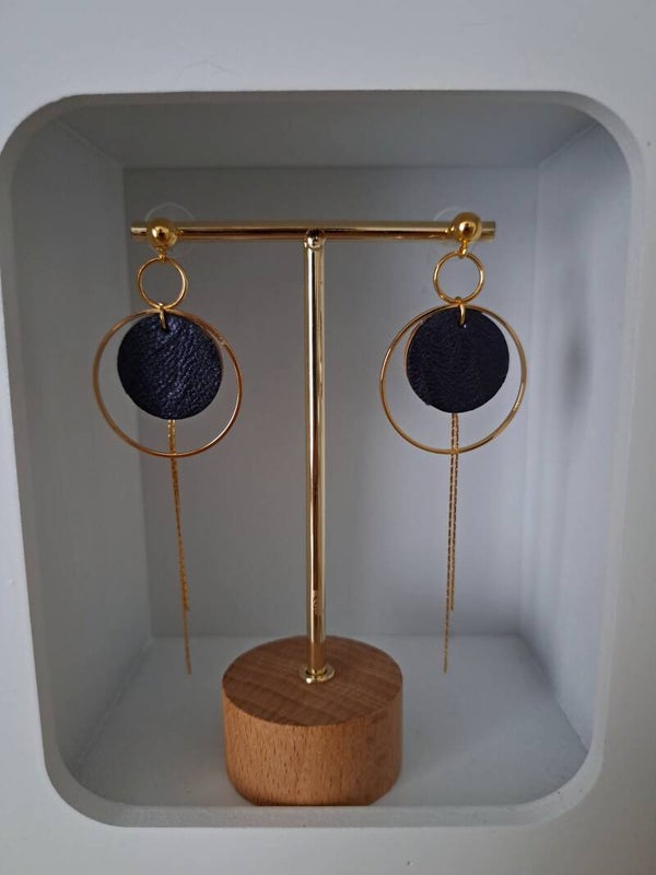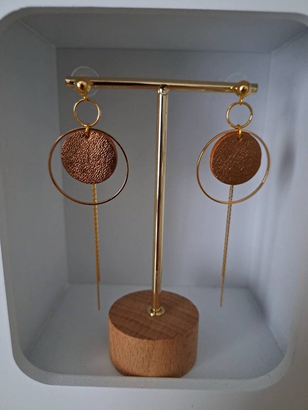 Boucles d'oreilles en cuir recyclé, attache en acier inoxydable plaqué or, pampilles en acier plaqué or, anneau en acier doré