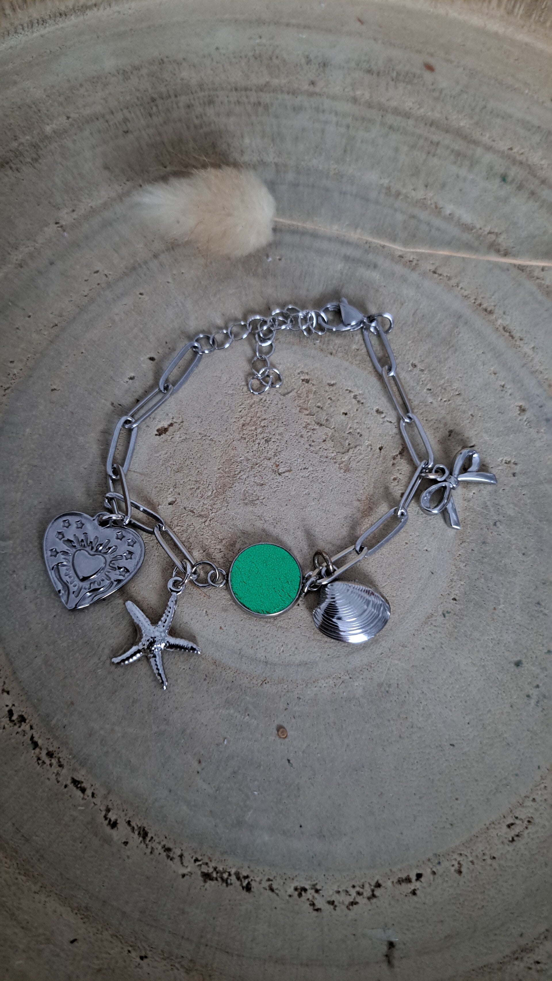 Bracelet en acier inoxydable ou acier inoxydable doré avec pampille et cabochon en cuir.