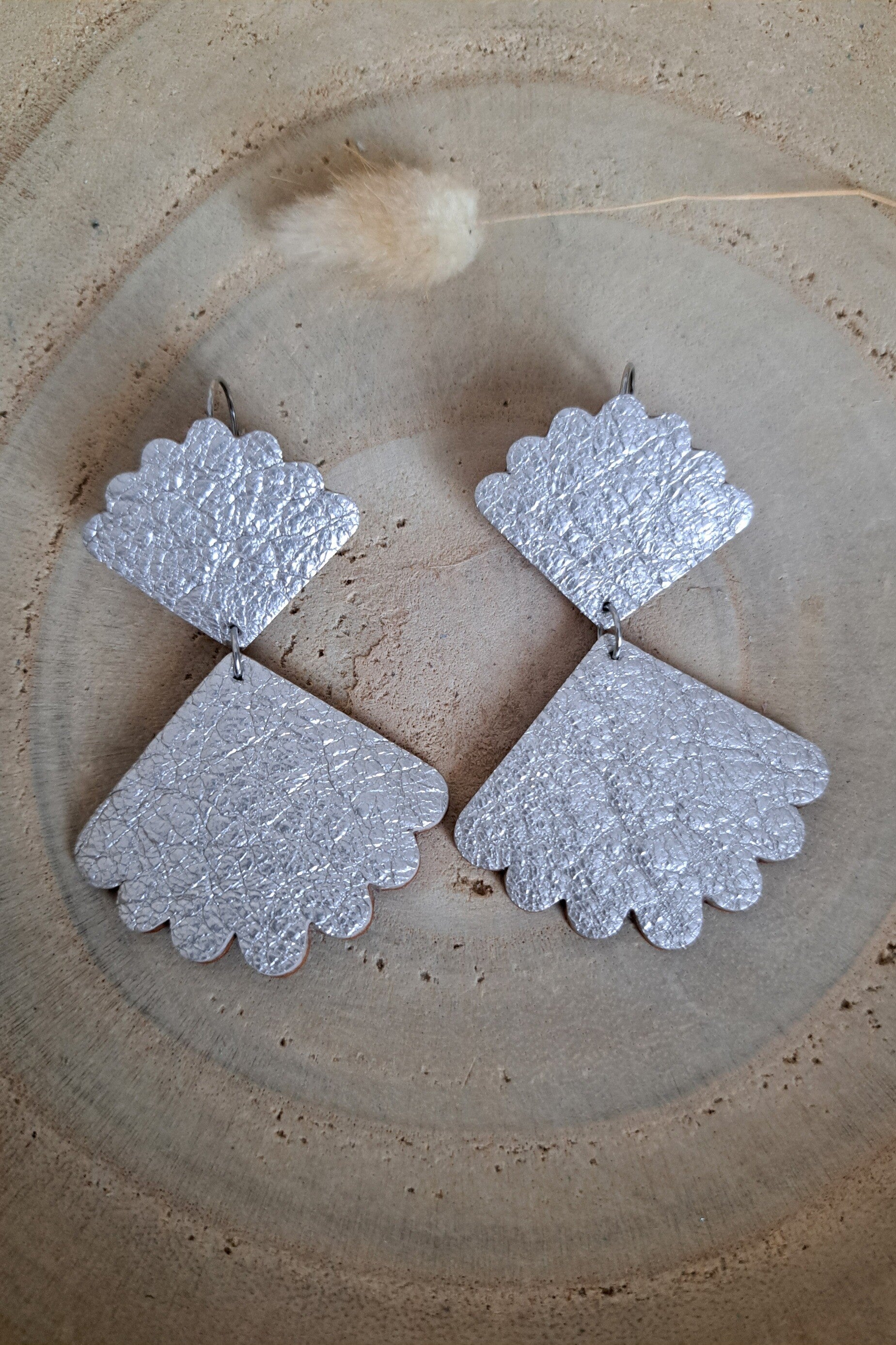 Illuminez votre tenue avec cette paire de boucles d’oreilles en cuir doré, délicatement façonnées à la main dans mon atelier. Leur forme en double éventail aux bords festonnés apporte un charme unique, à la fois graphique et féminin.