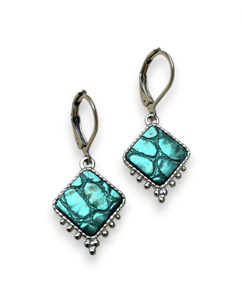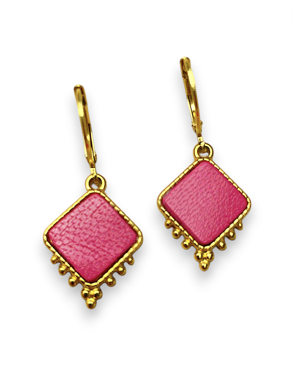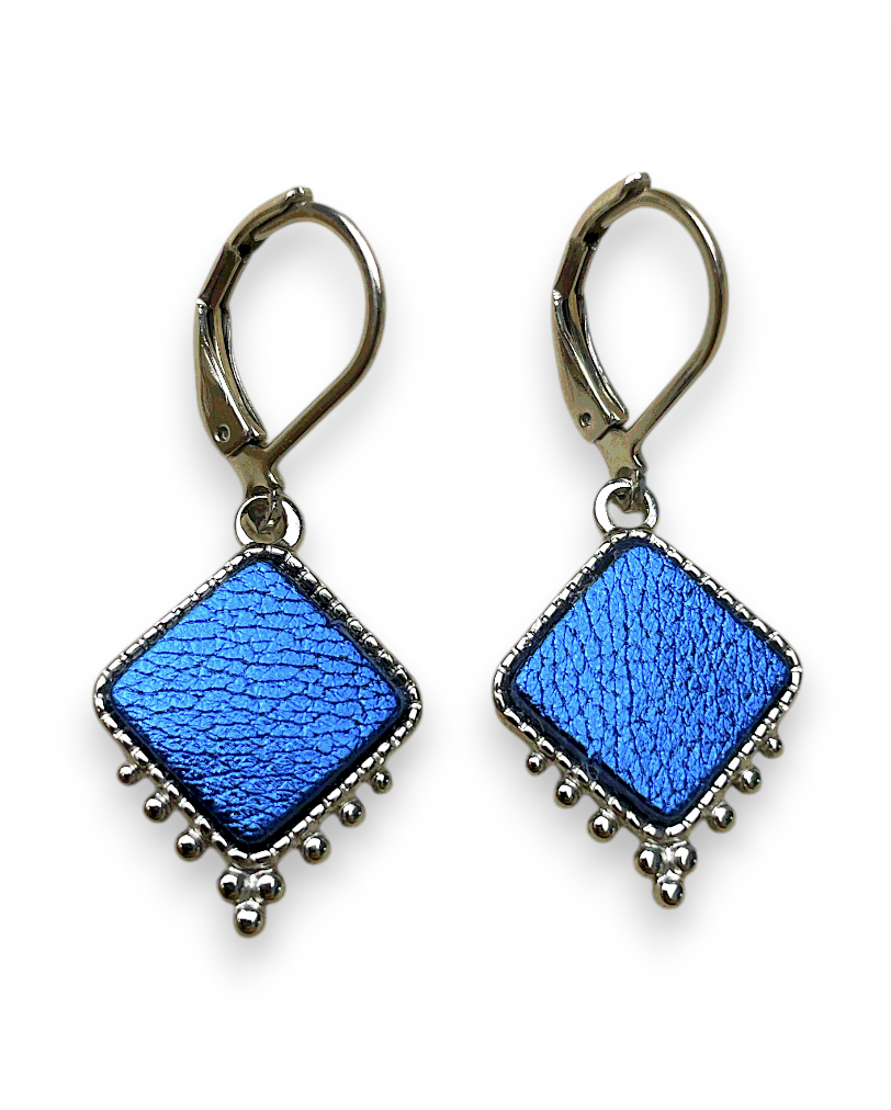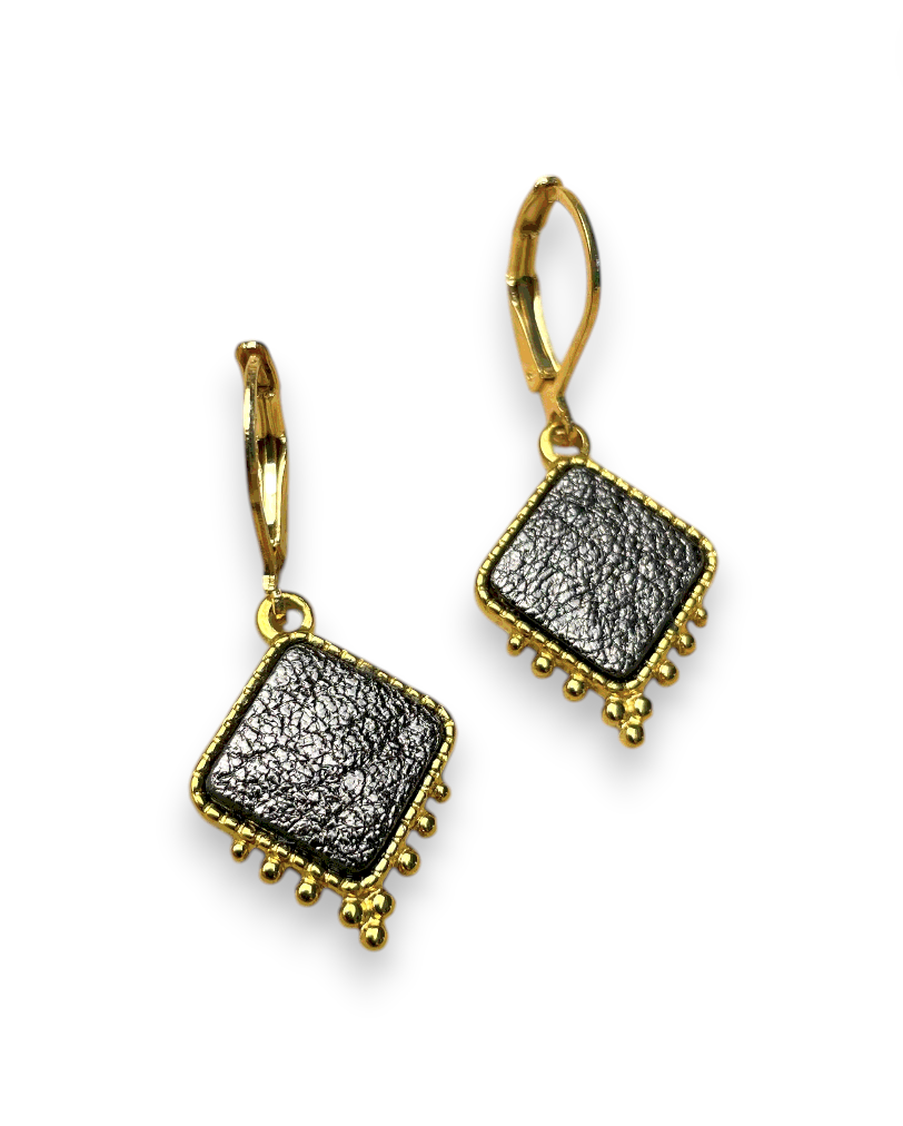 Laissez-vous séduire par ces boucles d’oreilles légères et graphiques, mêlant l’intensité du cuir recyclé à l’éclat intemporel de l’acier inoxydable. Leur forme carrée délicatement texturée est sublimée par de petites perles métalliques qui apportent un fini raffiné et féminin.